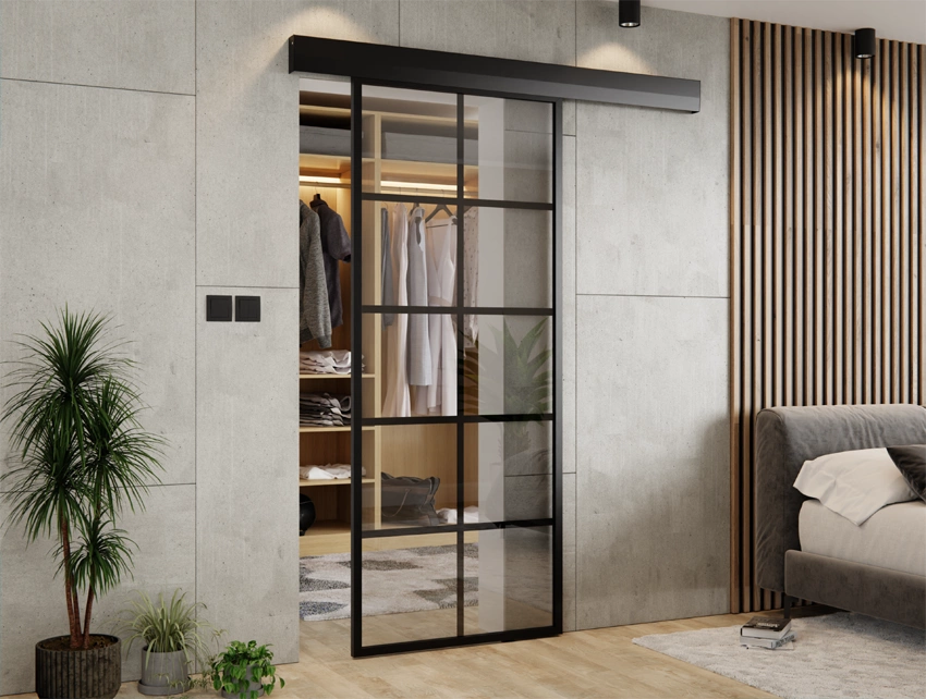 DRZWI PRZESUWNE SYSTEM ALUMINIUM CZARNE SATYNA 850X2100 (9 PÓL) Sito THOR
