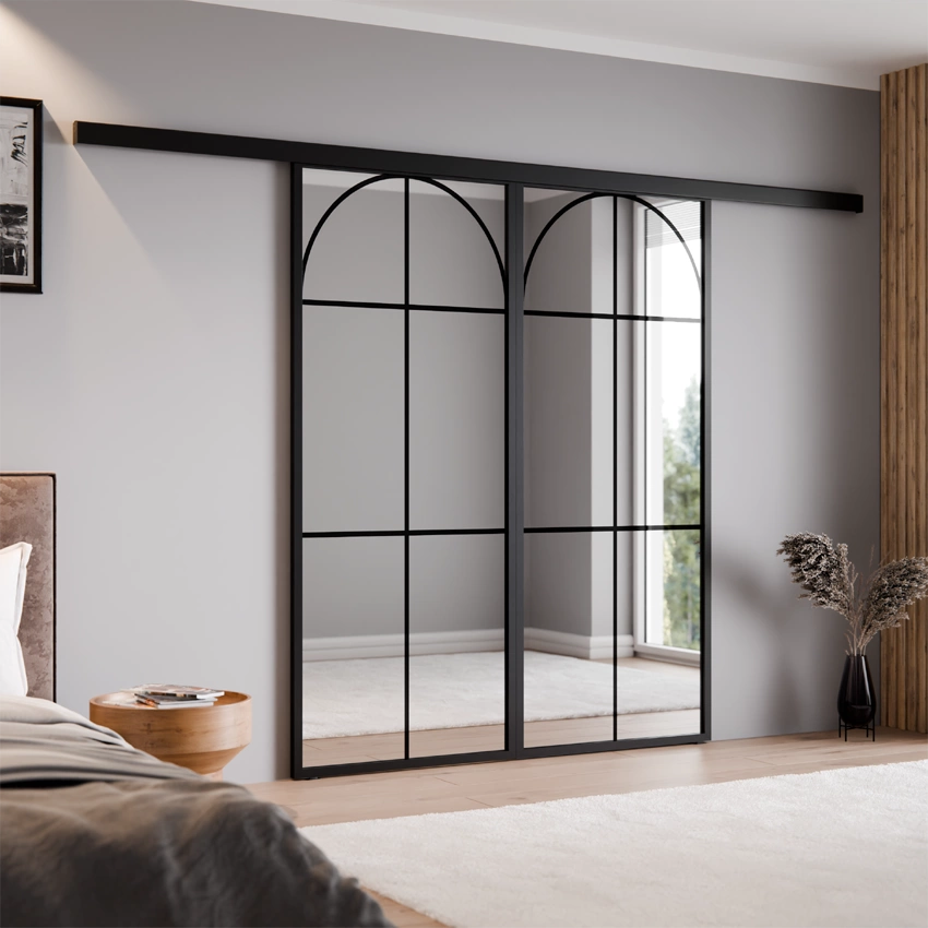 DRZWI PRZESUWNE PODWÓJNE ALUMINIUM CZARNE LUSTRO SREBRNE ŁUK 2 THOR
