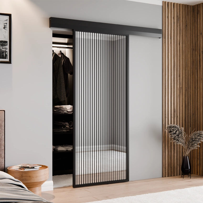 DRZWI PRZESUWNE SYSTEM ALUMINIUM CZARNE LUSTRO SREBRNE WĄSKIE LAMELE PASY THOR