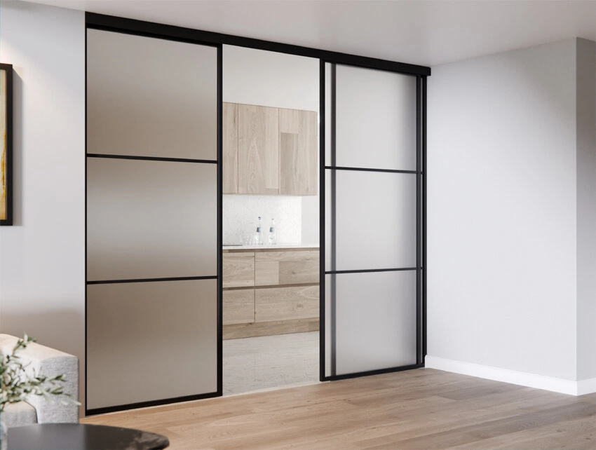 DRZWI PRZESUWNE PODWÓJNE ALUMINIUM CZARNE LUSTRO SREBRNE (Montaż do sufitu) LAGUNA