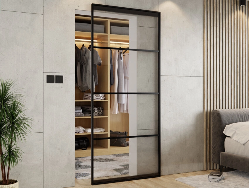 DRZWI PRZESUWNE PODWÓJNE ALUMINIUM CZARNE LUSTRO SREBRNE ŁUK 3 THOR